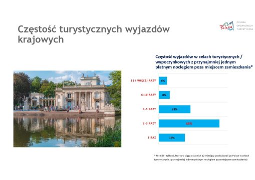 Z najnowszej ankiety dotyczącej krajowych podróży turystycznych wynika, że aż 91% respondentów wyjechało w ciągu ostatnich 12 miesięcy na co najmniej jeden wyjazd z płatnym noclegiem poza miejsce zamieszkania. Najczęściej wybieranym modelem podróżowania były krótkie wyjazdy – 44% badanych zadeklarowało, że w ciągu roku odbyło od dwóch do trzech podróży.