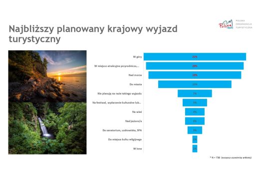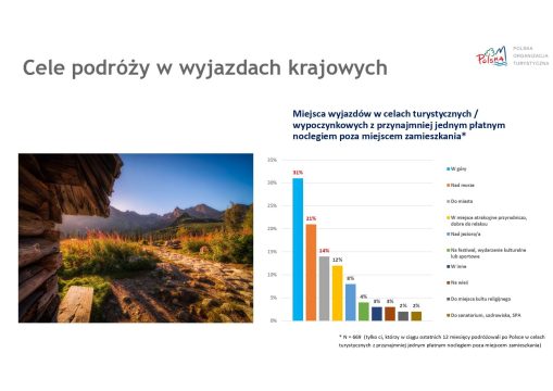 Najpopularniejszym okresem podróży jest lato – od czerwca do sierpnia, co potwierdza 55% respondentów. Na drugim miejscu znajduje się wiosna (marzec-maj) z wynikiem 27%. Jeśli chodzi o wybór kierunków krajowych, polskie góry cieszą się największą popularnością (31%), następnie morze (21%), miasta (14%) oraz miejsca atrakcyjne przyrodniczo i dobre do relaksu (12%).