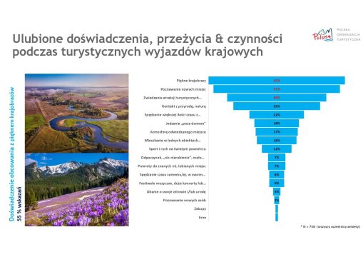 Badanie pokazuje, że największym atutem krajowych podróży jest piękno krajobrazów (55%), możliwość odkrywania nowych miejsc (51%) oraz zwiedzanie atrakcji turystycznych (40%). Ważną rolę odgrywa także kontakt z naturą (35%). Respondenci doceniają również możliwość porozumiewania się w ojczystym języku i atmosferę odwiedzanych miejsc.
