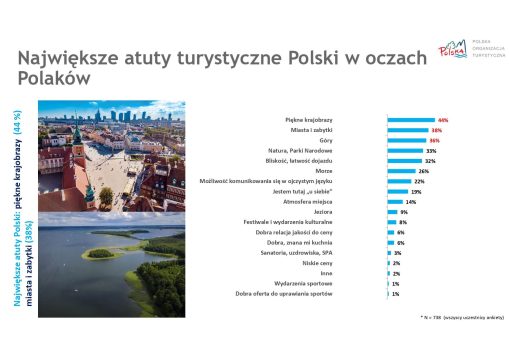 Wyniki badania „Polacy o Polsce 2024” pokazują, że krajowa turystyka cieszy się dużą popularnością, szczególnie wśród osób ceniących piękno krajobrazów, naturę i różnorodność dostępnych atrakcji. Jednocześnie coraz więcej Polaków decyduje się na zagraniczne podróże, kierując się chęcią odkrywania nowych miejsc i gwarancją dobrej pogody.