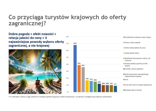 Mimo dużej popularności turystyki krajowej, 58% respondentów zadeklarowało, że w ciągu ostatniego roku wyjechało także za granicę. Głównymi powodami wyboru zagranicznych destynacji są chęć poznania nowych miejsc (68%), pewna i dobra pogoda (39%) oraz atrakcyjna relacja jakości do ceny (36%). Najczęściej wybierane kierunki to morze (44%), miasta (24%) oraz góry (13%).
