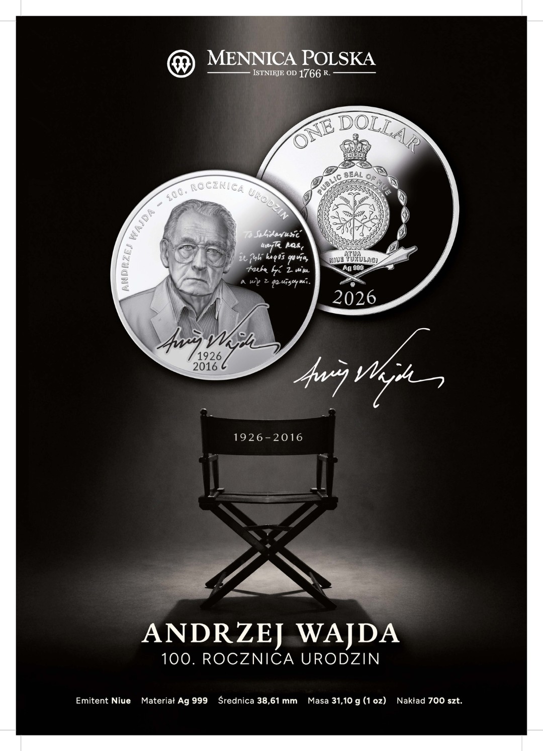 Mennica Polska wprowadza na rynek srebrną monetę kolekcjonerską z wizerunkiem Andrzeja Wajdy, przygotowaną z okazji setnej rocznicy urodzin reżysera. Moneta stanowi hołd dla twórcy, którego filmy kształtowały wrażliwość społeczną i przekazywały wartości takie jak wolność, odpowiedzialność i godność człowieka. Premiera planowana jest na 6 marca 2026 r., w rocznicę urodzin Mistrza.