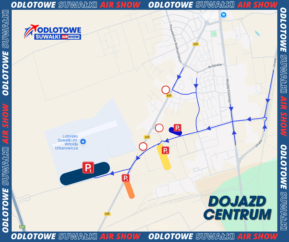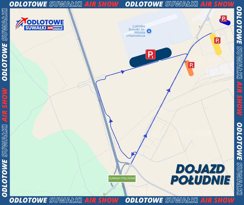 W związku z organizacją pokazów wprowadzone zostaną istotne zmiany w organizacji ruchu w bezpośrednim sąsiedztwie lotniska. Ulica Raczkowska będzie wyłączona z ruchu na odcinku od skrzyżowania z ulicą Warszawską. Dojazd z centrum miasta jest zalecany przez ulice Utrata oraz Wojska Polskiego. Alternatywną drogę stanowią drogi techniczne wzdłuż obwodnicy Suwałk, do których można dotrzeć od strony ulic Bakałarzewskiej i Zastawie. Od strony południowej ruch będzie odbywał się ulicą Raczkowską oraz ciągiem technicznym przy obwodnicy. Przygotowano nowe lokalizacje parkingów przed terenem lotniska, co ma na celu usprawnienie rotacji pojazdów i rozładowanie ruchu na głównym placu postojowym. Parkingi zostały umiejscowione w najbliższej możliwej odległości od wejść na teren imprezy. Zalecamy się śledzenie aktualnych komunikatów transportowych w mediach społecznościowych wydarzenia.