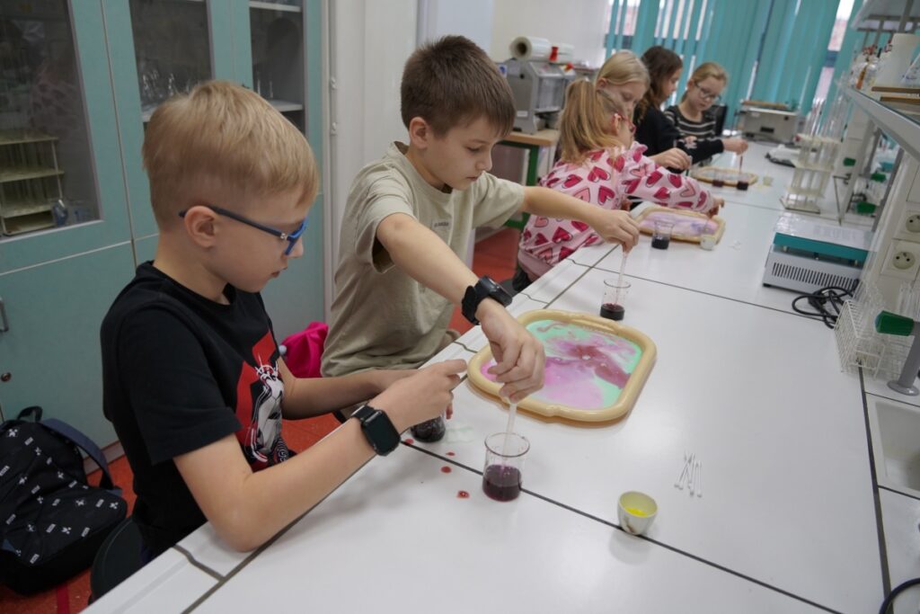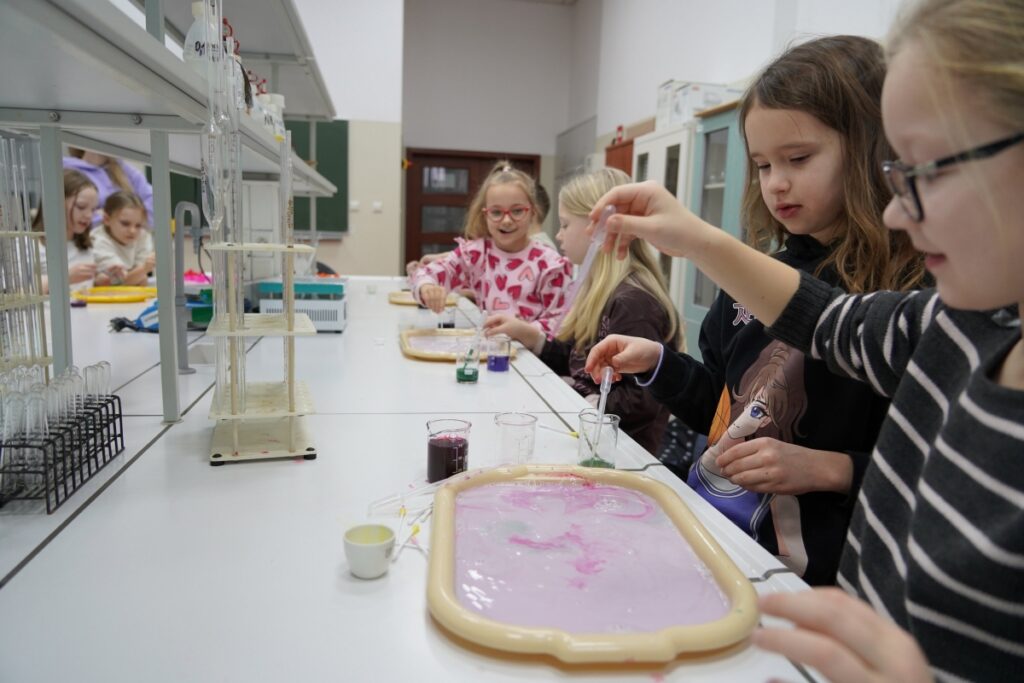 W laboratoriach Wydziału Politechnicznego odbyły się warsztaty zatytułowane „Dzieło sztuki w mleku”, które łączyły elementy plastyczne z nauką o zjawiskach fizycznych i chemicznych. Uczestnicy, pod merytoryczną opieką dr Marty Matusiewicz i mgr Urszuli Kolenkiewicz, tworzyli barwne kompozycje, wykorzystując właściwości cieczy. Podczas tych działań dzieci miały okazję zaobserwować reakcje zachodzące między różnymi substancjami oraz zrozumieć podstawowe prawa rządzące napięciem powierzchniowym i dyfuzją.