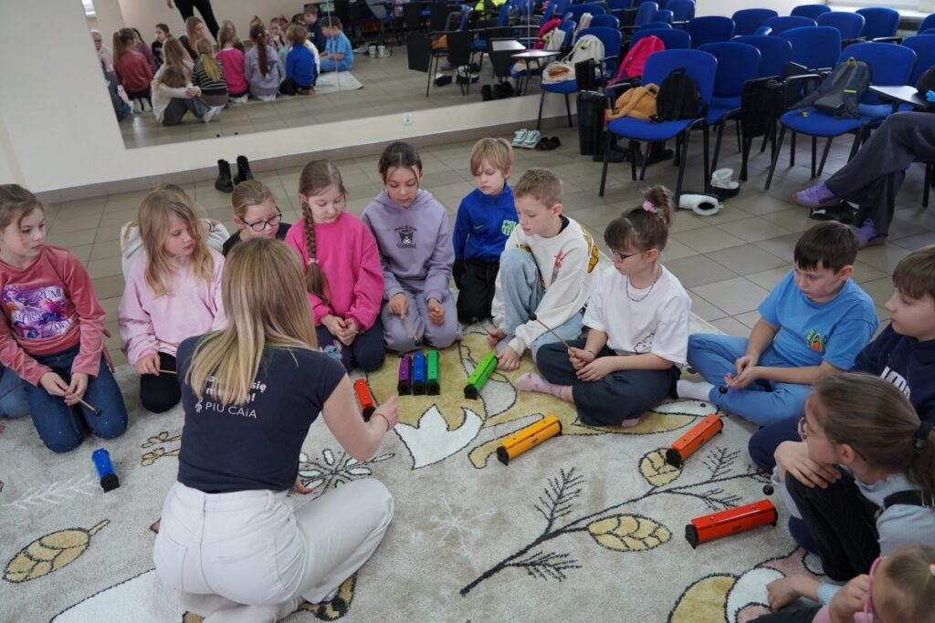 Uzupełnieniem bloku nauk ścisłych były zajęcia artystyczne „Kolorowe dźwięki”, prowadzone przez mgr Izabelę Korżyńską. Warsztaty te koncentrowały się na odkrywaniu świata muzyki poprzez aktywne działanie i zabawę. Dzieci badały zagadnienia związane z rytmem oraz barwą dźwięków, rozwijając swoją wrażliwość słuchową i poczucie estetyki. Prowadząca zastosowała metody aktywizujące, które pozwoliły uczestnikom na bezpośrednie doświadczanie muzyki.