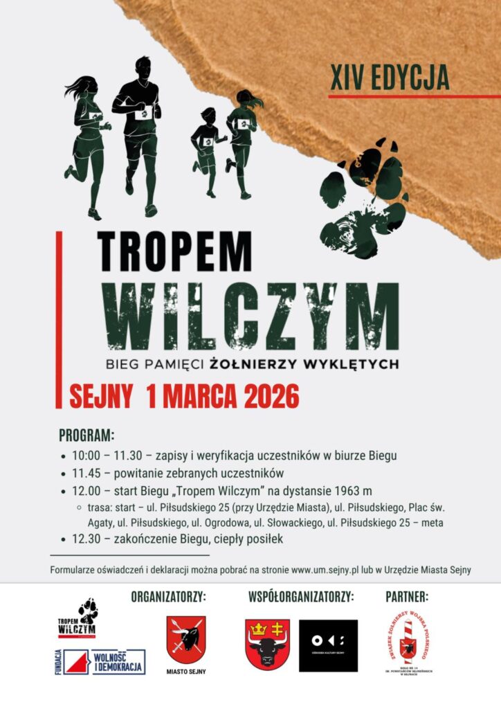 1 marca 2026 r. w Sejnach odbędzie się Bieg Pamięci Żołnierzy Wyklętych „Tropem Wilczym” na symbolicznym dystansie 1963 metrów. Zapisy prowadzone są w Urzędzie Miasta Sejny, w szkołach oraz w dniu zawodów, jeśli pozostaną wolne miejsca. Pakiety startowe i medale otrzyma pierwszych 100 zgłoszonych uczestników. Start zaplanowano przy Urzędzie Miasta, a trasa obejmuje dwie pętle ulicami centrum.